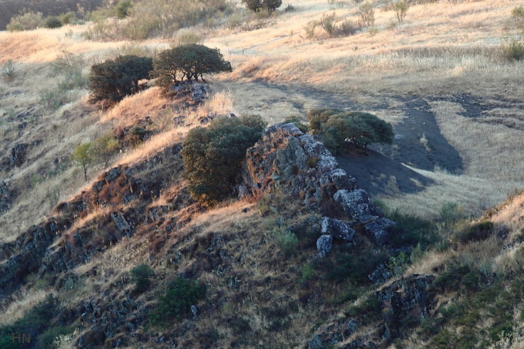 Al final del camino dejé el coche, que estaba otra vez cubierto de polvo, y bajé campo a través en dirección a los riscos donde hacía unos años se posaba a otear un águila culebrera, más o menos a esa misma hora tras el amanecer. Desde una ladera cercana enfoqué los prismáticos: nada… moviéndolos recorrí ese paisaje estepario de sierras desgastadas, solo animado por el hilo verdoso de un arroyo que a duras penas desafiaba con sus charcos al sol implacable del verano. En el horizonte, algunos volcanes desventrados por canteras recordaban que esa tierra era el Campo de Calatrava y servían de fondo violáceo a una corza y su corcino, que desayunaban en un altozano, reducidos por la distancia casi a puntos entre encinas negruzcas. Ningún otro animal aparecía en escena.