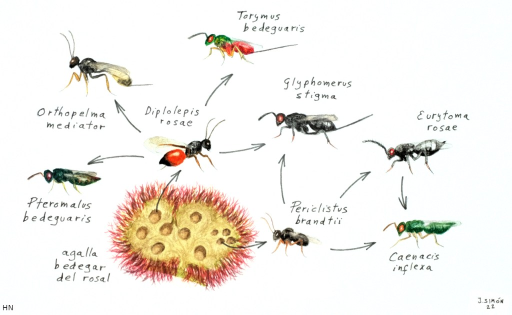 Tras un invierno en el bedegar, al llegar el final de la primavera emergerán de él las nuevas Diplolepis, casi todas hembras de color negro y vientre rojo. Salen listas para pasar las escasas dos semanas que les quedan de vida poniendo huevos, sin necesidad de aparearse antes de ello (los machos, de hecho, parecen ser innecesarios en esta especie). Las Diplolepis ponen sus huevos en las yemas del rosal; a cada una pueden dedicarle hasta dos horas, insertándole cuidadosamente hasta treinta huevos. Esto dará origen a un nuevo bedegar, de cuyos tejidos vegetales se alimentarán las larvas (las avispas de las agallas no dejan de ser unos peculiares insectos comedores de plantas). ¿Pensaremos que son muy inteligentes por vivir dentro de su propio alimento, protegidas del mundo exterior en tan extraña mansión? Error; veamos a qué peligros pueden enfrentarse en el bedegar…