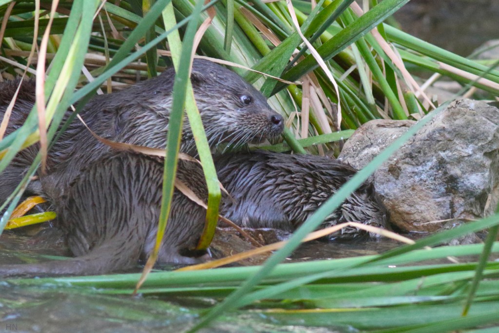 A través de las ramas pude verlas sin ser visto; eran grandes, ágiles, de pelaje lustroso. Nadaban por la orilla de enfrente, a escasos metros de mí, parándose de vez en cuando para mirar las piedras del carrizal. Así se acercaron a varias rocas de buen tamaño, que pesarían varios kilos sin duda, y mientras una de las nutrias miraba a la otra con ojos bastante desorbitados, su compañera se puso a hacer palanca, con manos y cabeza, para levantar un pedrusco tras otro, alzándolos lo justo para asomarse a curiosear qué había debajo. La otra nutria pronto la imitó. Los crujidos rotundos que se oyeron después me informaron de que estaban desayunando cangrejos, algo que probablemente solo se le puede ocurrir a una nutria. Los cascaban con tal fuerza que cerraban los ojos al apretar las mandíbulas, y parecían disfrutar mucho de ese crujiente almuerzo. Al cabo de un rato empezaron a nadar dando vueltas al cauce, y luego dejaron que el agua las llevase más abajo, perdiéndose de vista mientras los primeros rayos del sol se filtraban entre las copas de los chopos.
