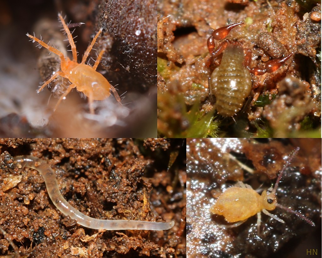 Los más fáciles de ver eran unos parientes saltarines de los insectos, los cólembolos. Pronto se perdían de un salto, impulsados por un golpe dado con la horquilla que llevan plegada bajo el abdomen. Los había plateados, con escamas como de pez, pero también verdes oscuros, o lechosos, o amarillo limón con cuerpo globular. Los más pequeños, que me parecían los jóvenes, salían casi siempre de entre las hojas más profundas. Quizá se escondían allí porque esas capas guardan mejor la humedad, o son más seguras, ya que al estar las hojas más aplastadas quedan menos huecos por donde puedan entrar sus enemigos. Porque los tenían, y muy peligrosos.