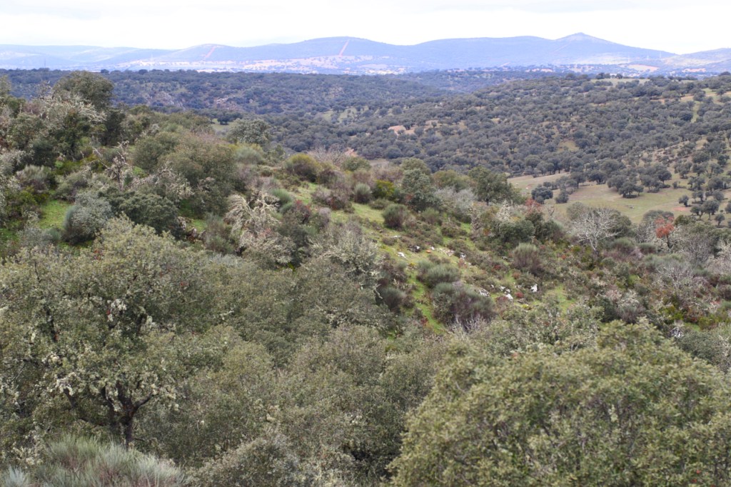 El terreno cambia: a pocos centenares de pasos empiezan a verse cantos de arenisca, y también de cuarcita, esa roca durísima capaz de cortar el cristal. A través de las encinas distingo un claro. Me aparto a indagar y doy con una suerte de mirador que se alza sobre un barranco montuoso, repleto de encinar impenetrable. Desde aquí se ve al fondo la sierra de Luciana, hacia el norte, y más cerca los cerros verdes que dan al valle del arroyo de las Huertas y a los de sus afluentes, el arroyo de las Navezuelas, el del Hondón, el de la Nava… Un rebaño de ovejas cruza despacio una ladera lejana. Un cuervo grazna, casi se diría que ladra, mientras planea bajo unos buitres leonados.