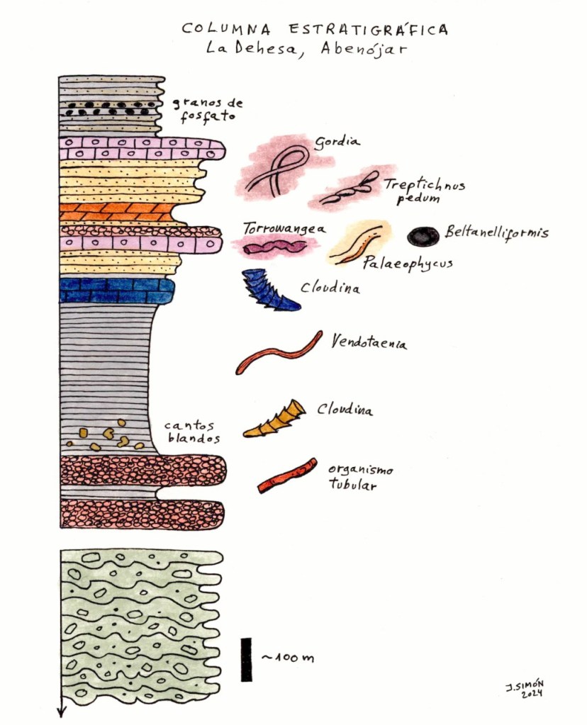 A mi alrededor motean el pasto bloques sueltos de una roca grisácea, azulada. Como se raya con la navaja y es efervescente al ácido, mi clave de campo la identifica como caliza. Algunas de estas calizas muestran tonos ocres y pequeños círculos oscuros, o tubitos. Son fósiles del primer animal con concha conocido, Cloudina, que vivió en los mares hace como quinientos cincuenta millones de años, cuando los animales empezaban a poblar el mundo. Su presencia en este rincón de las sierras de Abenójar era desconocida hasta que la encontré, y ahora intento entender qué lugar ocupan las capas rocosas con Cloudina en la geología de esta zona, es decir, ¿qué hubo antes de ese mar somero donde habitaban? ¿Qué vino después?