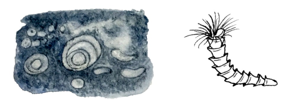 Al instante desaparece el roquero tras una grieta. Sabe por instinto que esa silueta equivale a la muerte. Muchas son las avecillas que en otoño encuentran en las garras del gavilán una muerte venida del cielo, literalmente. Puede el gavilán nutrirse de pájaros porque su cuerpo está hecho de lo mismo que el de ellos: proteínas, grasas, azúcares… Lo mismo cabe decir de cualquier ser que vive de comerse a otros, como nosotros. Así, nuestra existencia es una prueba del parentesco estrecho que hay entre todas las formas de vida, pues compartimos una misma química que posibilita que nos robemos nutrientes unos a otros. Pero hubo un tiempo sin esta clase de ladrones, cuando en La Tierra aún no había animales, esos expertos en robar nutrientes ajenos. Nuestro roquero está posado en el final de aquel tiempo. La roca que forma su hogar se originó a partir de cantos y arena en una costa remota, en un mar donde los primeros animales iniciaban el reinado del »come y sé comido». Uno de esos primerísimos animales, Cloudina, aparece fosilizado abundantemente entre esos riscos, no lejos del pueblo de Abenójar. Sus fósiles nos muestran a un ser similar a un pequeño gusano marino, protegido por una peculiar armadura mineralizada, la primera concha conocida. ¿Acaso ya era necesario por entonces resguardarse del apetito de los carnívoros? Eso parece, pues en China se han hallado conchas de Cloudina con agujeros, como si un diminuto predador las hubiese taladrado para consumir al animal. Eso mismo hacen hoy muchos caracoles marinos, que agujerean conchas para devorar a su ocupante.