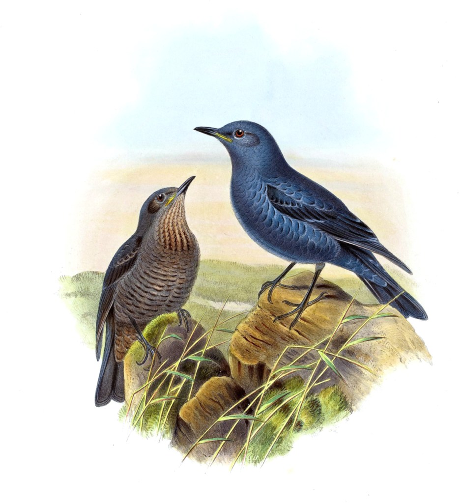 Desde lo más alto de un risco, un pájaro recorta su silueta contra el azul. Su plumaje es mucho más azul que el cielo, pero oscuro, de un añil que con la distancia parece casi negro. En español lo llaman »roquero solitario», por su afición a las risqueras y a mostrarse en soledad.